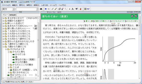 岩波書店から刊行されている育児書の新定番『育育児典』が電子辞典になりました。人生の一大イベント、初めてで戸惑う事が多い育児について、暮らし編と病気編の2編構成で分かりやすく解説されています。体調に問題があるなら病気編を、子供の生活全般で不安や疑問があるなら暮らし編をすぐに参照できます。発熱、腹痛などから引ける「症状別ガイド」、子育てに関するサービスと制度がわかるページを設けるなど、使いやすさも重視。