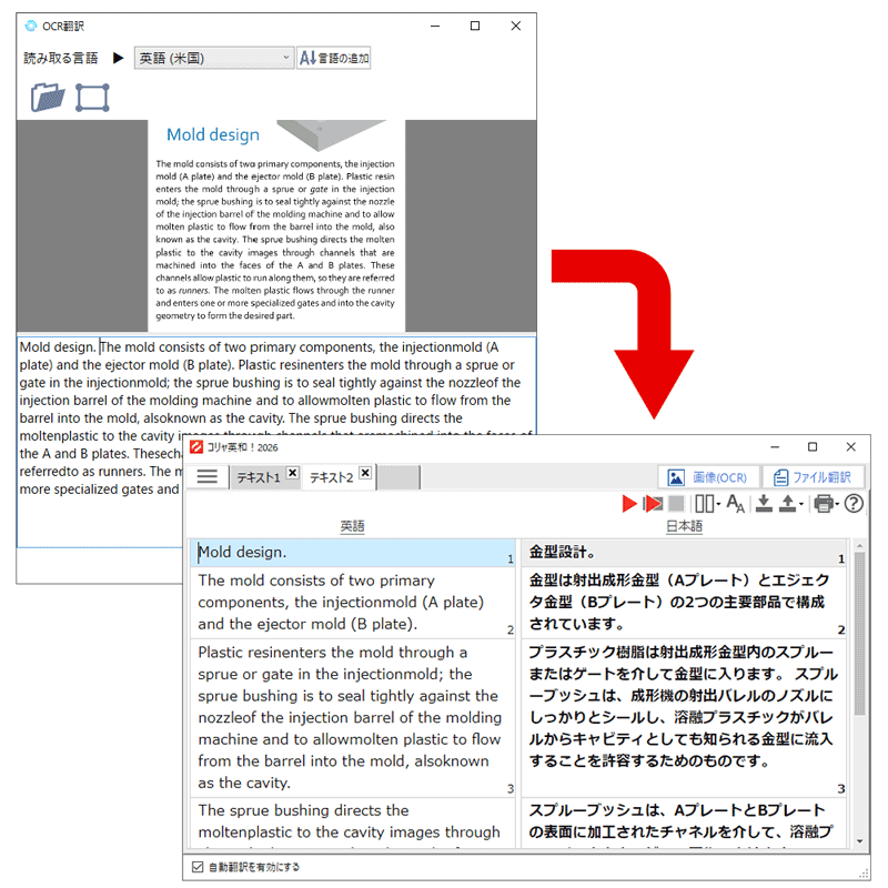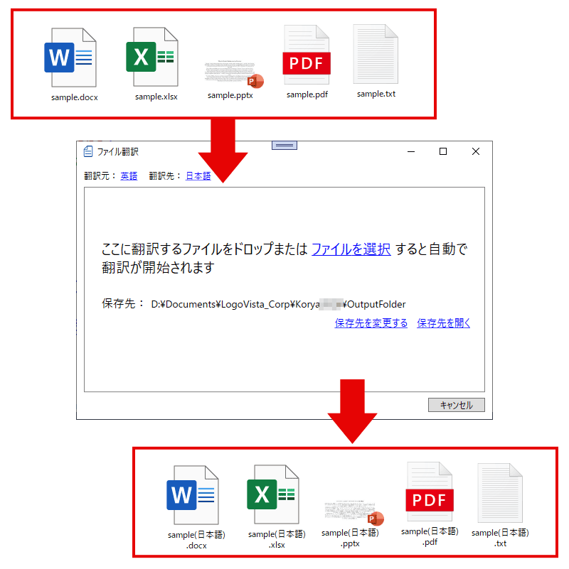原文が保存されたファイルを読み込み、自動で翻訳された内容を別ファイルとして保存・表示し、翻訳結果をすぐにご確認いただけます。