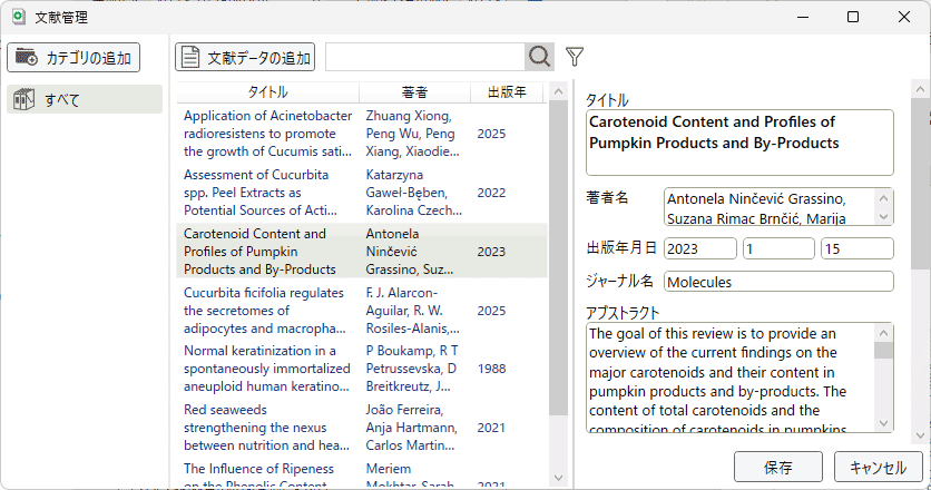 DOIやPMIDなどの識別子からの自動登録はもちろん、手動入力にも対応。タイトル、著者、出版年月日、ジャーナル名、アブストラクト、ユーザーメモ、DOI、URL、添付ファイルなど、多彩な項目を保存できます。さらに、文献カテゴリの作成・編集機能により、分野やテーマごとに効率よく分類可能。蓄積した文献をいつでもすぐに活用できる環境を提供します。