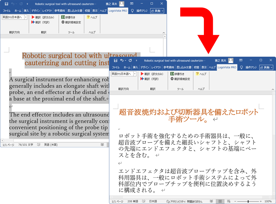 Microsoft Word、Excel、PowerPoint、一太郎 に対応。アプリ内からワンクリックで翻訳が可能です。 Wordでは選択したテキストだけを翻訳したり、Excelではセル内の文字をそのまま翻訳するなど、文書作成の流れを妨げずにスムーズにご利用いただけます。