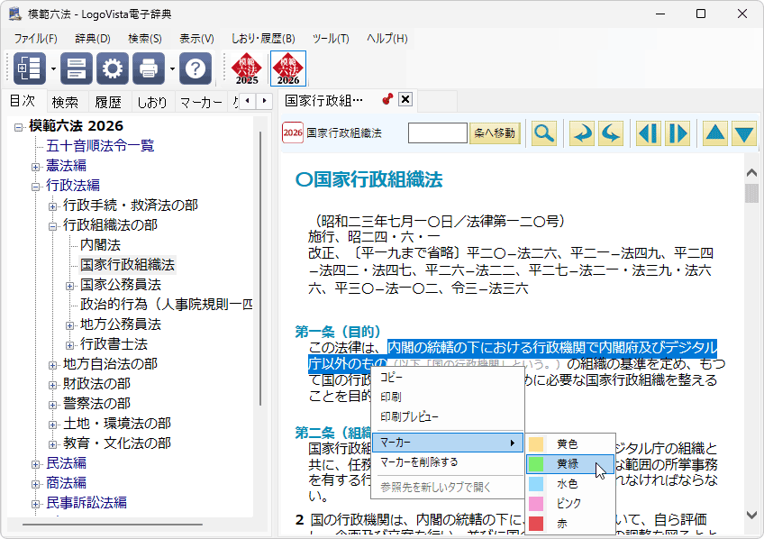 気になる条文や覚えておきたいポイントに、マーカーで色をつけて強調できます。