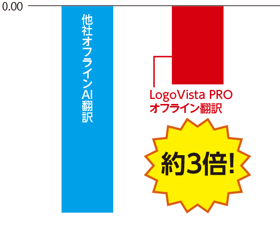 「LogoVista PRO オフライン翻訳」は、最適化されたエンジンにより、他社のオフライン翻訳と比較して約3倍のスピードを実現しています。大量の文書処理やビジネス用途においても、翻訳にかかる待ち時間を大幅に短縮し、業務効率を飛躍的に向上させます。