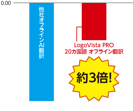 「LogoVista PRO オフライン翻訳」は、最適化されたエンジンにより、他社のオフライン翻訳と比較して約3倍のスピードを実現しています。大量の文書処理やビジネス用途においても、翻訳にかかる待ち時間を大幅に短縮し、業務効率を飛躍的に向上させます。