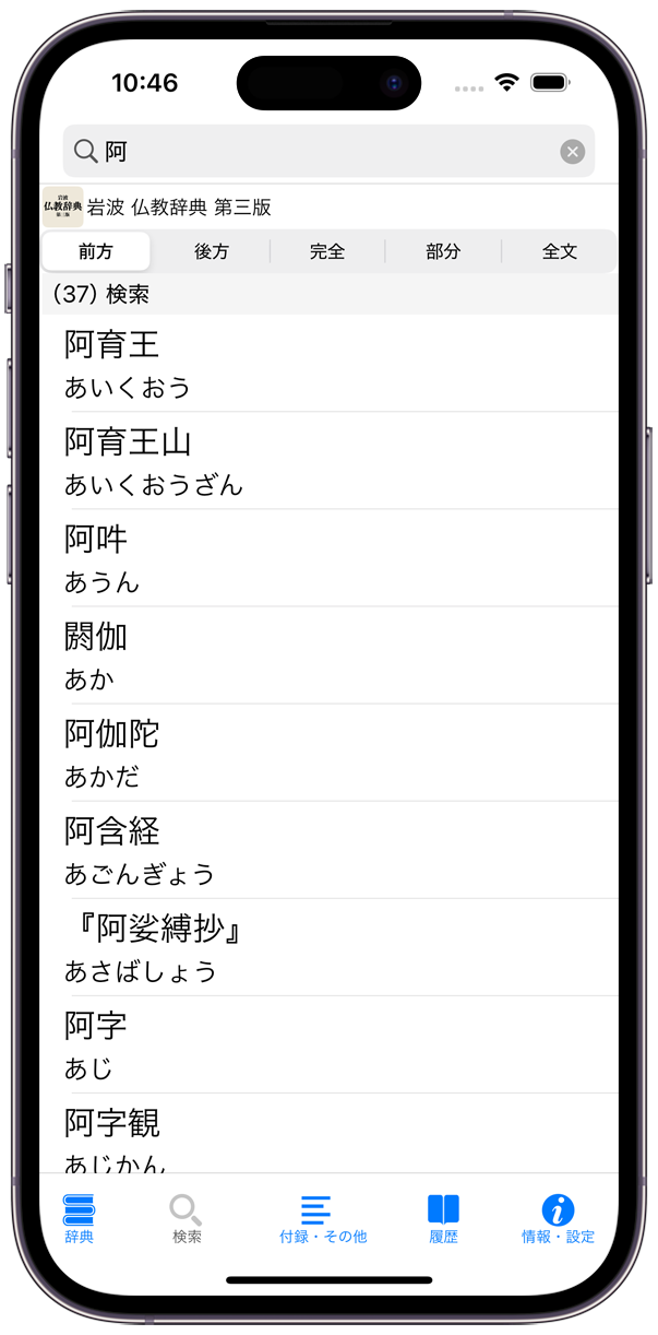 それぞれの検索方法で、文字を入力すると候補見出し語が表示されるインクリメンタルサーチに対応(部分一致/全文検索を除く)