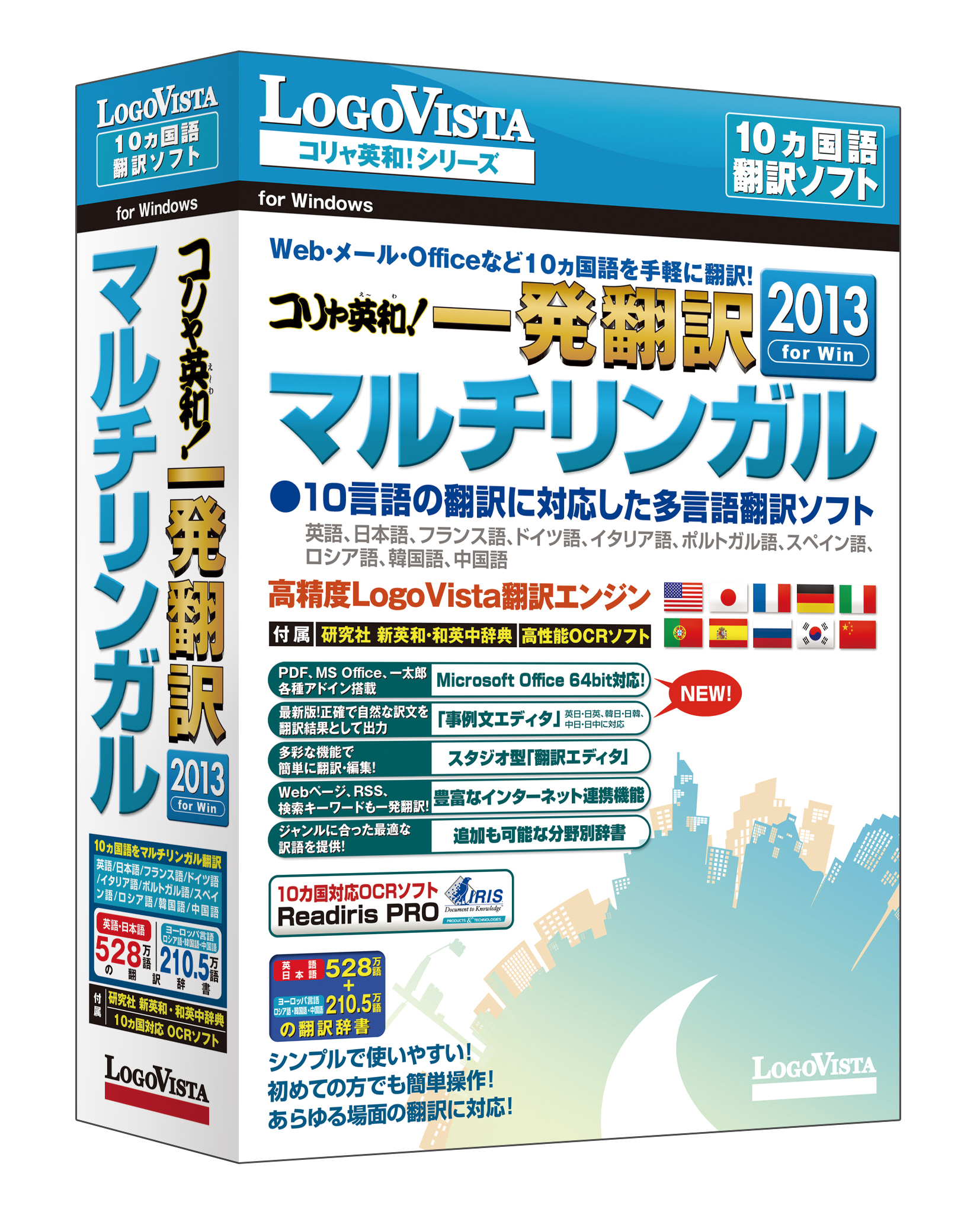 2013 for Win」シリーズの多言語対応製品「コリャ英和!一発翻訳 2013 for Winマルチリンガル」を、2012年7月13日(金)より、全国パソコンショップ、カメラ系量販店、大手書店などで発売いたします。