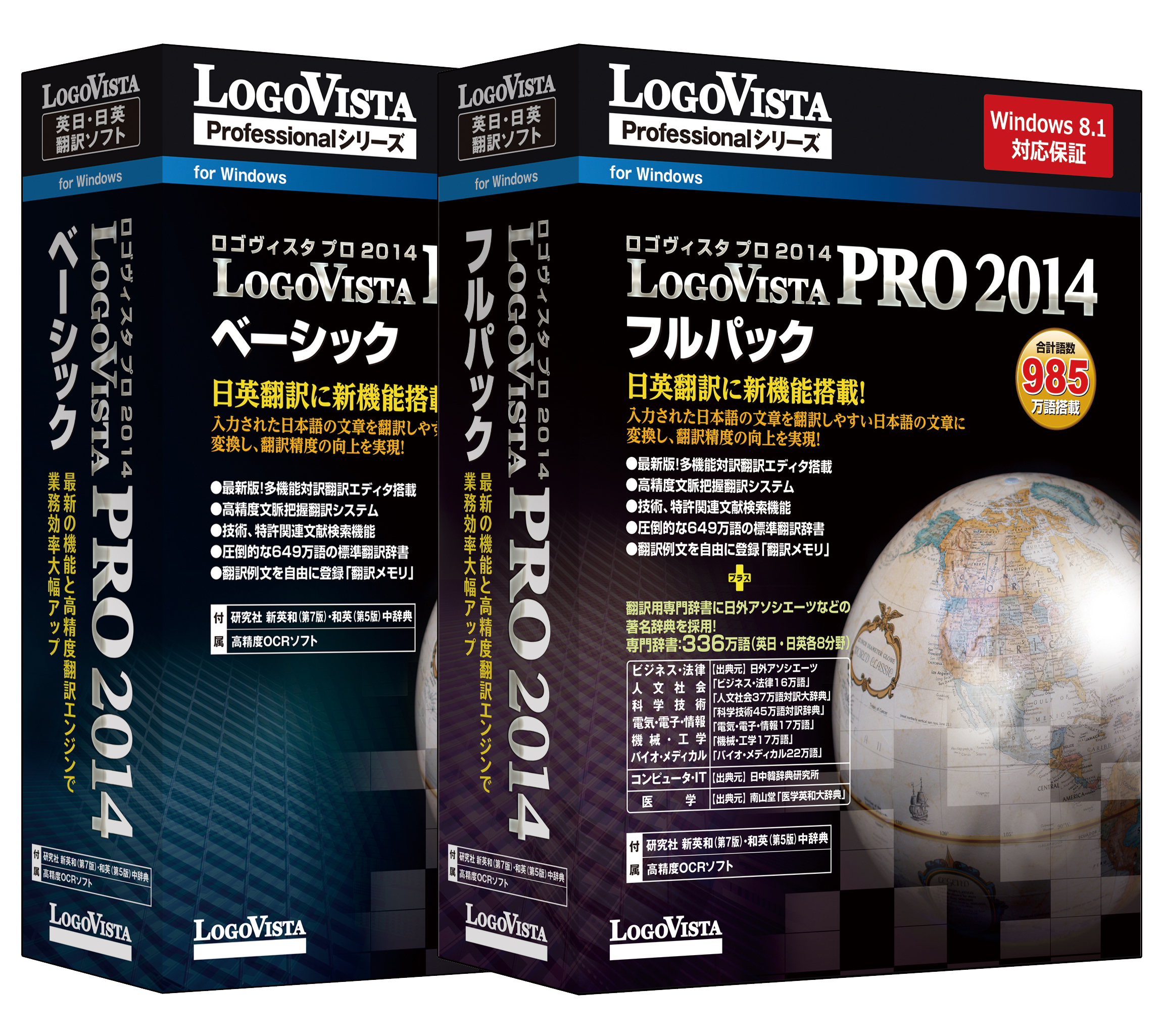 同時発売の上位モデル「LogoVista PRO 2014 フルパック」では、翻訳辞書の総語数が985万語(649万語+著名なビジネスシーンで使用される専門辞書合計336 万語(英日・日英各8 分野))と業界最大の辞書語数を搭載し、翻訳業務を強力にバックアップします。