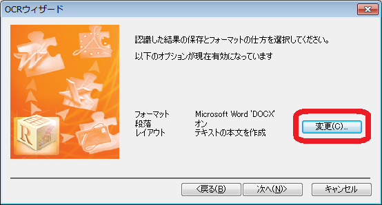 認識結果を保存するフォーマットは、初期設定では Word が選択されています。変更せずに、Wordファイルとして保存する場合には「次へ」ボタンをクリックします。
