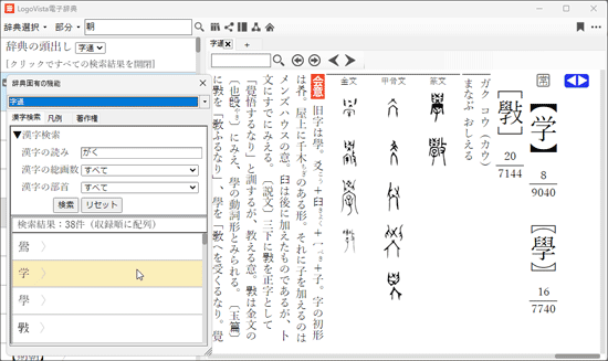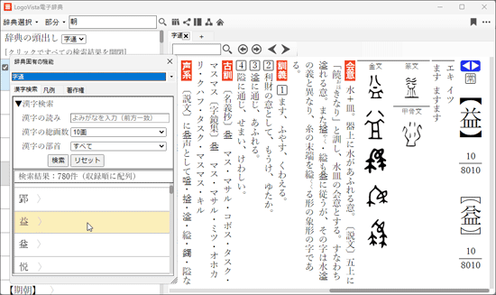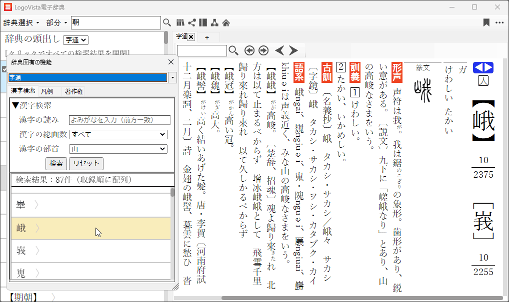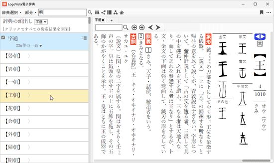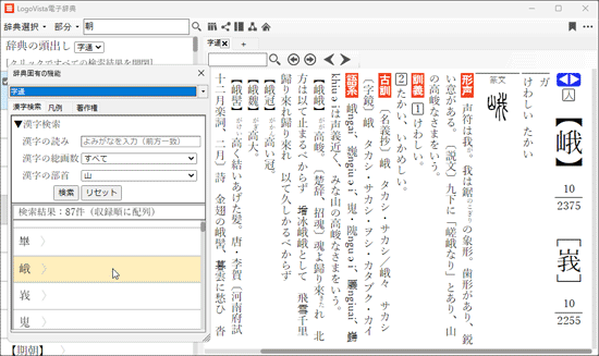 入力された検索キーワードから条件に一致する見出し語を検索します。検索実行時の一致条件について「部分一致/前方一致/後方一致/完全一致/全文検索」の切り替えが行えます。
