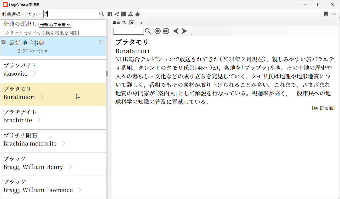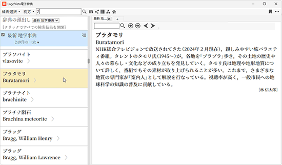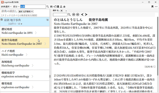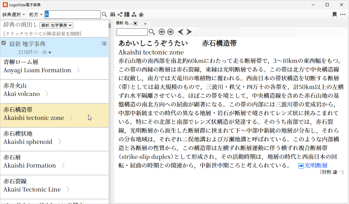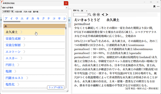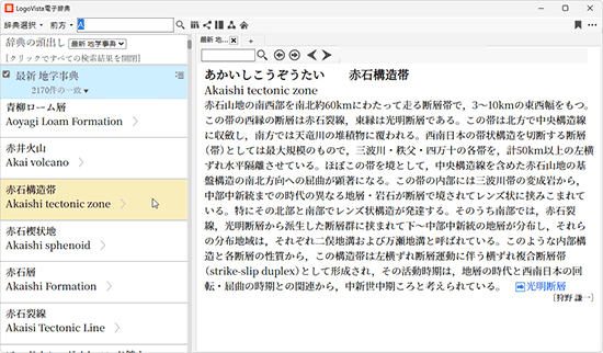 入力された検索キーワードから条件に一致する見出し語を検索します。検索実行時の一致条件について「部分一致/前方一致/後方一致/完全一致/全文検索」の切り替えが行えます。