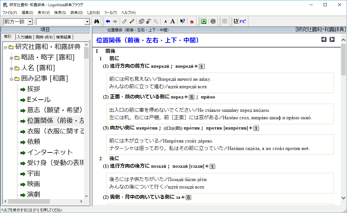 『研究社露和・和露辞典』は、専門語から俗語・文語なども含む26万の語彙に加えて、基本語に対する豊富な用例や類義語欄による言葉の使い分けの解説など学習要素も兼ね備えた「研究社露和辞典」と、日常語から専門語にいたる6万9千の語彙とともに会話・作文に生きる多様な用例を収録し、語法解説や文化情報なども充実した「研究社和露辞典
