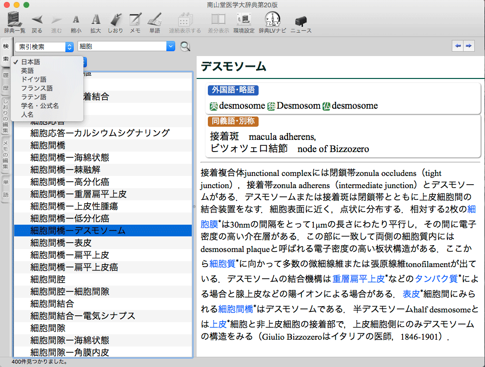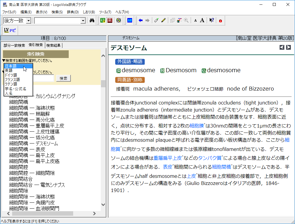 索引検索では日本語、英語、ドイツ語、フランス語、ラテン語、学名・公式名、人名の範囲から語句を入力して検索が可能です。