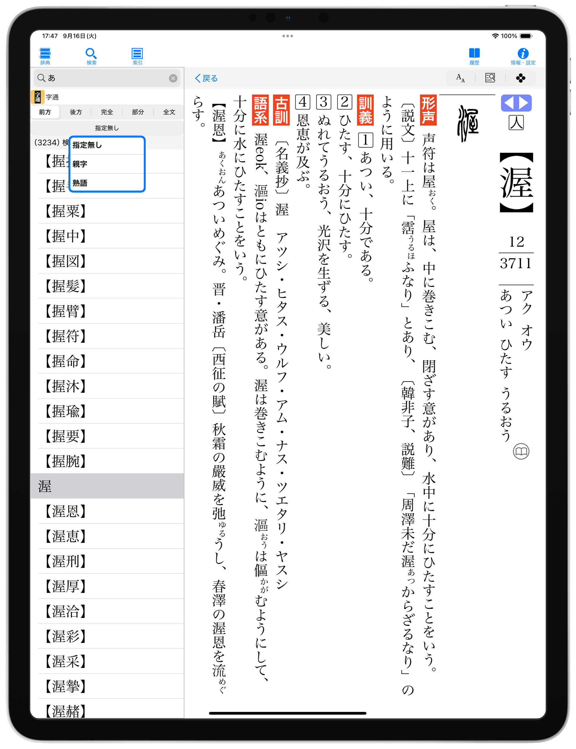 また、漢字検索では「漢字の読み」「漢字の総画数」「漢字の部首」から検索することが可能。