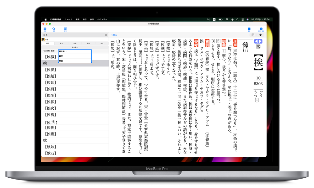 検索実行時の一致条件について、「部分一致/前方一致/後方一致/完全一致/全文検索」の切り替えが行え、検索の対象は、各項目の親字、および用語例(熟語)となっております。