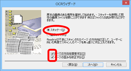 必要に応じて「ページの方向を探索する」と「ページの歪みを修正する」にもチェックを入れます。