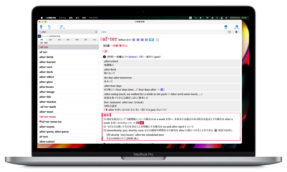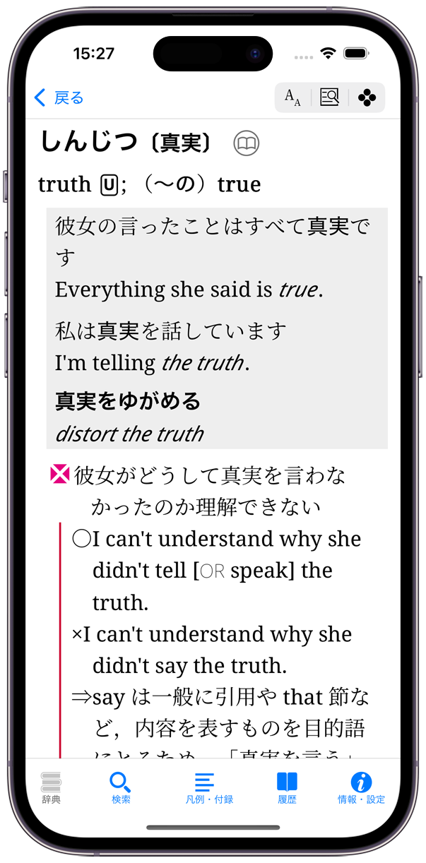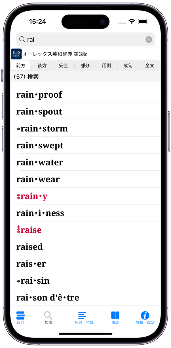 - それぞれの検索方法で、文字を入力すると候補見出し語が表示されるインクリメンタルサーチに対応(部分一致/全文検索/用例検索/成句検索(英和辞典)/索引・付録を除く)