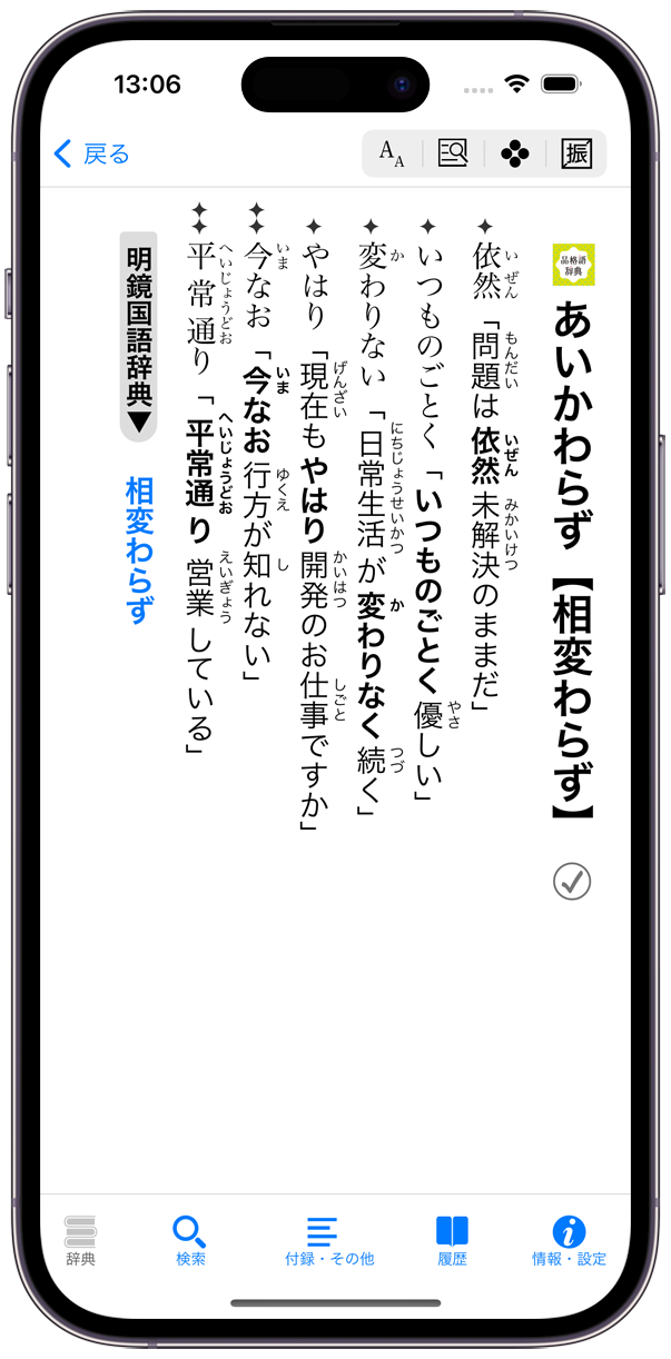 書籍版の『明鏡国語辞典 第三版』で既にふりがなを振っている漢字に加え、辞典本文の解説・用例中で使用している漢字等に、新たにふりがなを振りました。 辞書引きした解説に、読めない漢字があることが無くなります。また、学習用途としても、ご利用できます。 追加されたふりがなは、表示・非表示を簡単に切り替えることができます。