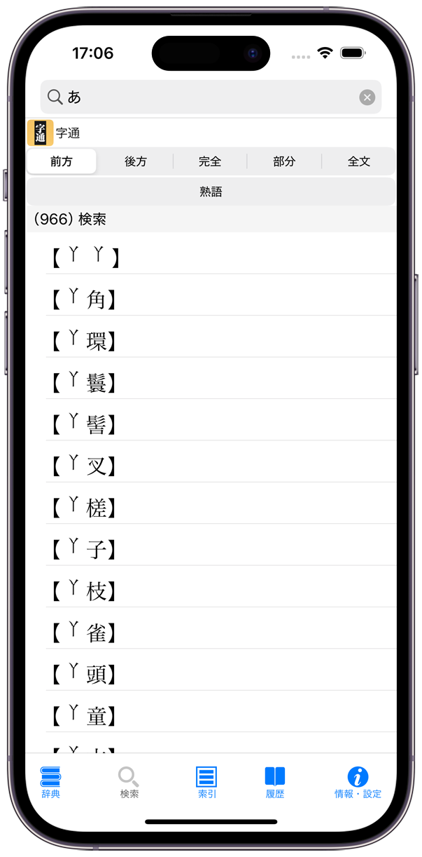 それぞれの検索方法で、文字を入力すると候補見出し語が表示されるインクリメンタルサーチに対応(部分一致/全文検索を除く)