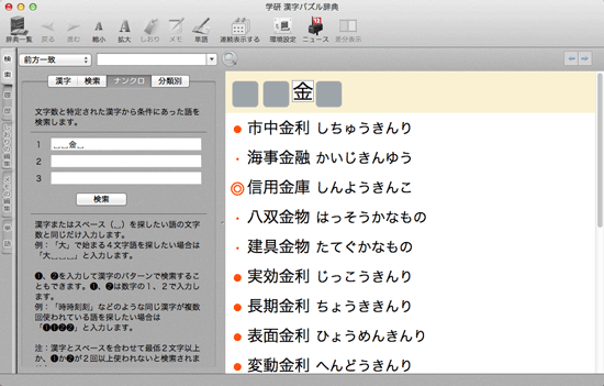 ナンクロ検索・分類別索引・漢字検索を搭載し、何文字の語でも一字だけが解れば探し出すことが可能です。
