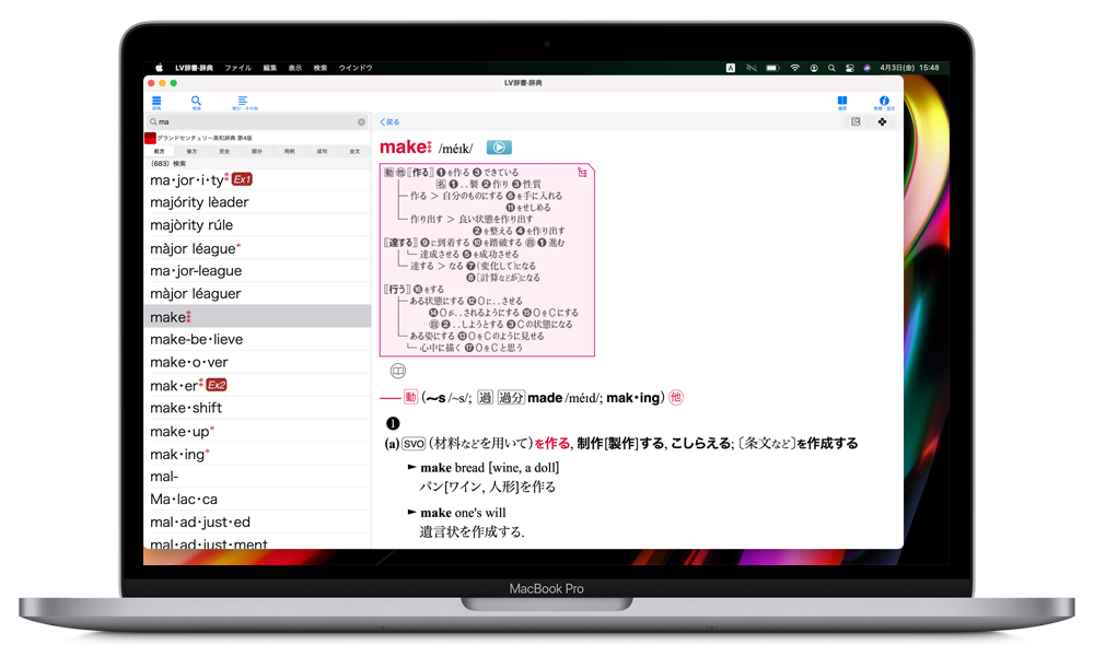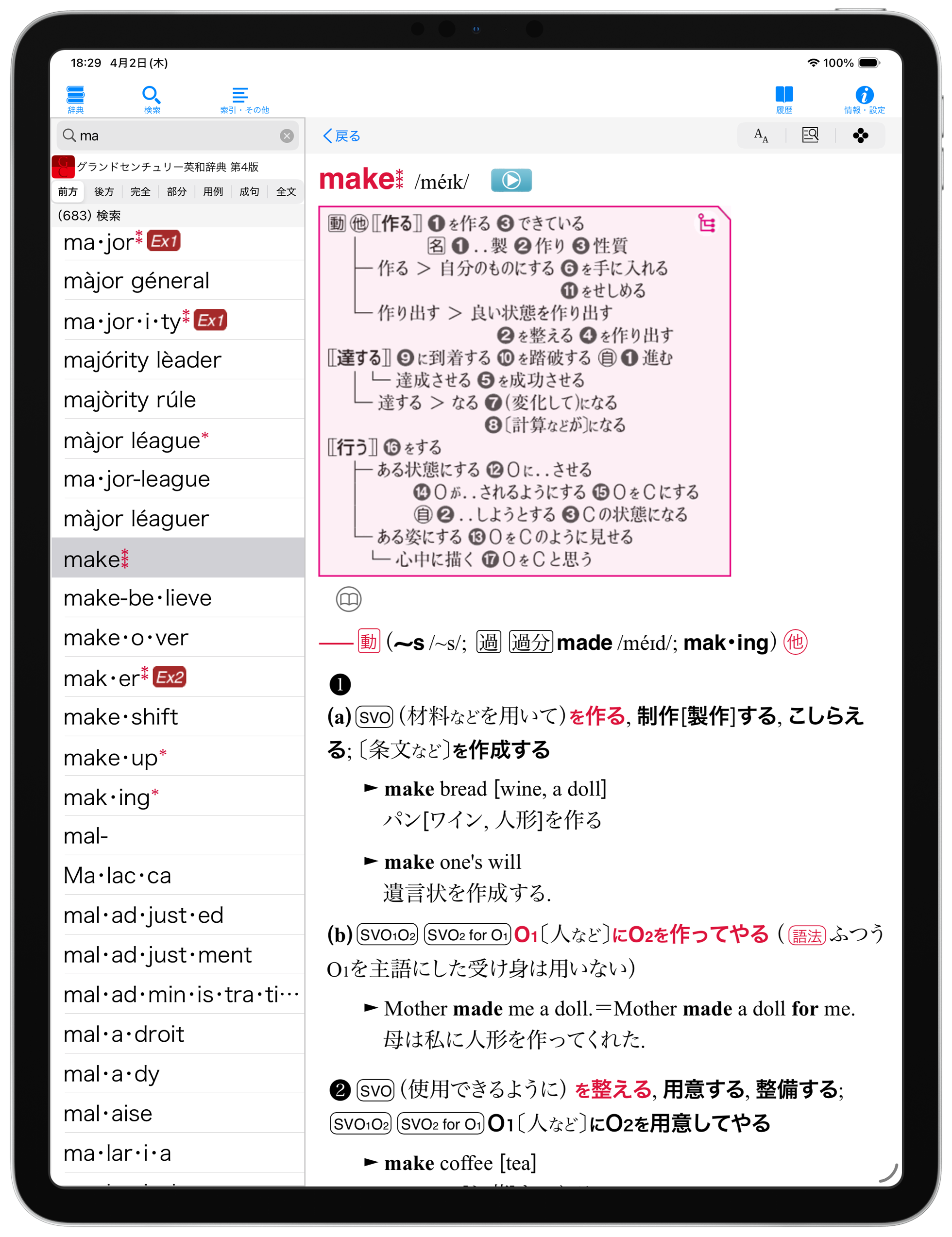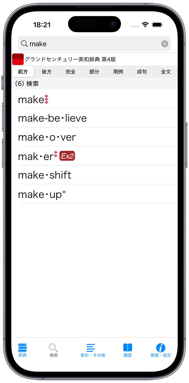 - それぞれの検索方法で、文字を入力すると候補見出し語が表示されるインクリメンタルサーチに対応(部分一致/全文検索/用例検索/成句検索/索引/付録を除く)