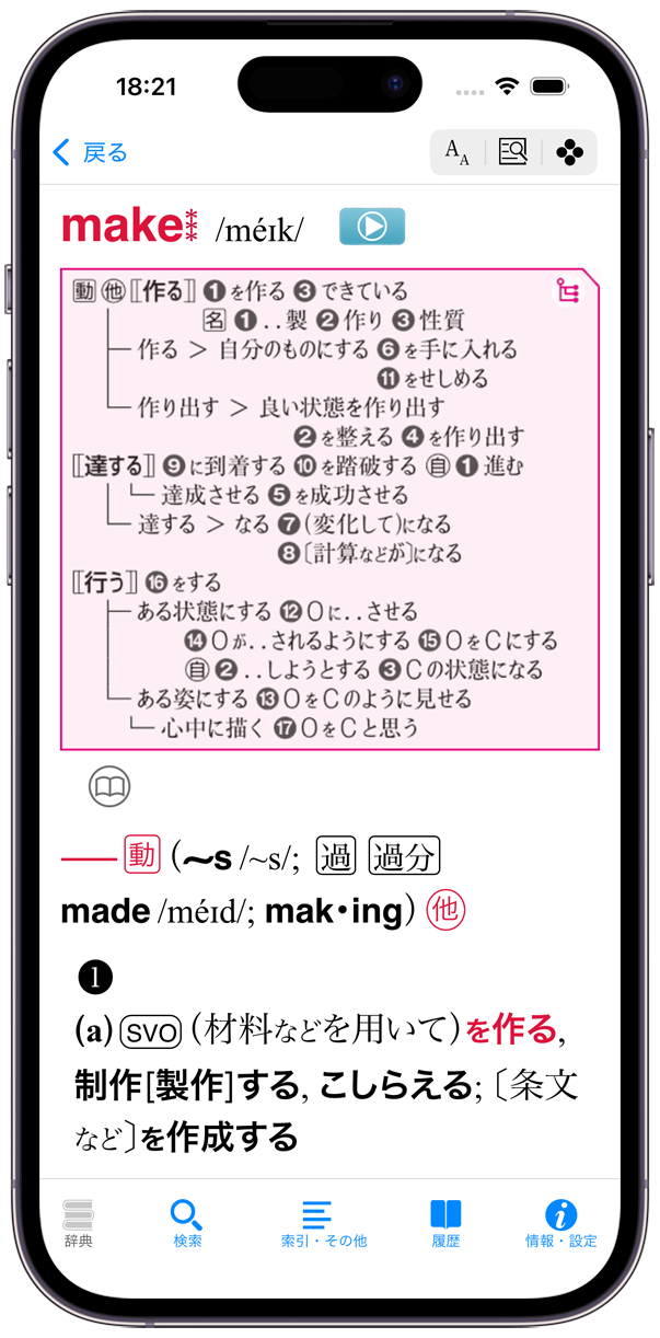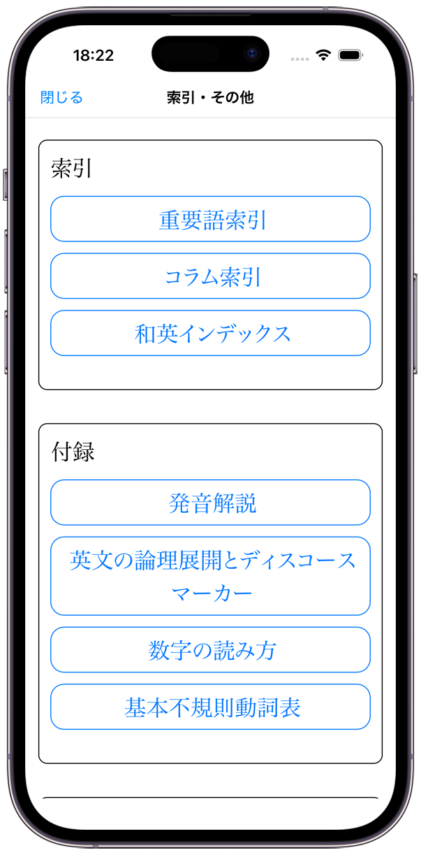 前方一致/後方一致/完全一致/部分一致/全文検索/用例検索/成句検索/索引(重要語索引、コラム索引、和英インデックス)/付録(発音解説、英文の論理展開とディスコースマーカー、数字の読み方、基本不規則動詞表)