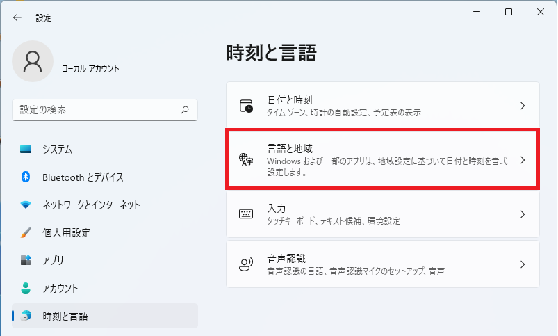 スタートメニューから[設定]を選択し、表示された設定ダイアログで、[時刻と言語]を選択します。