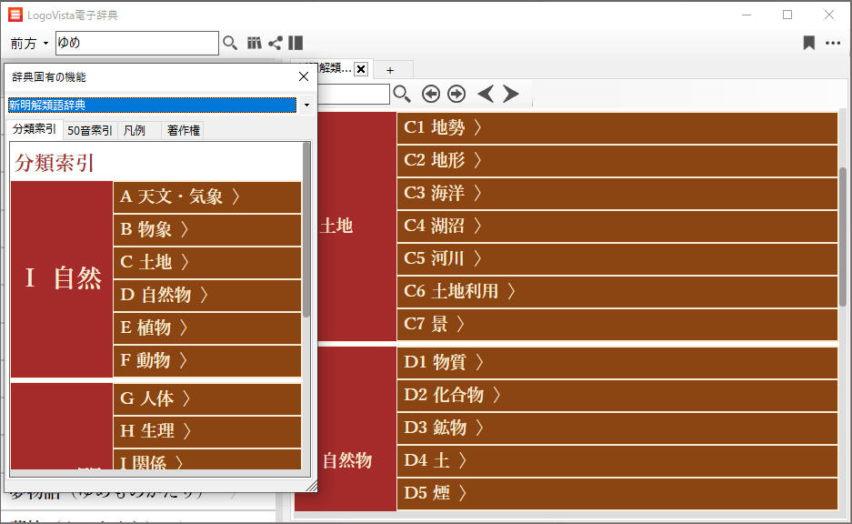 日本語の全体像を大きく【自然】【人間】【文化】に三分し他分類と50音の索引から検索します。 |