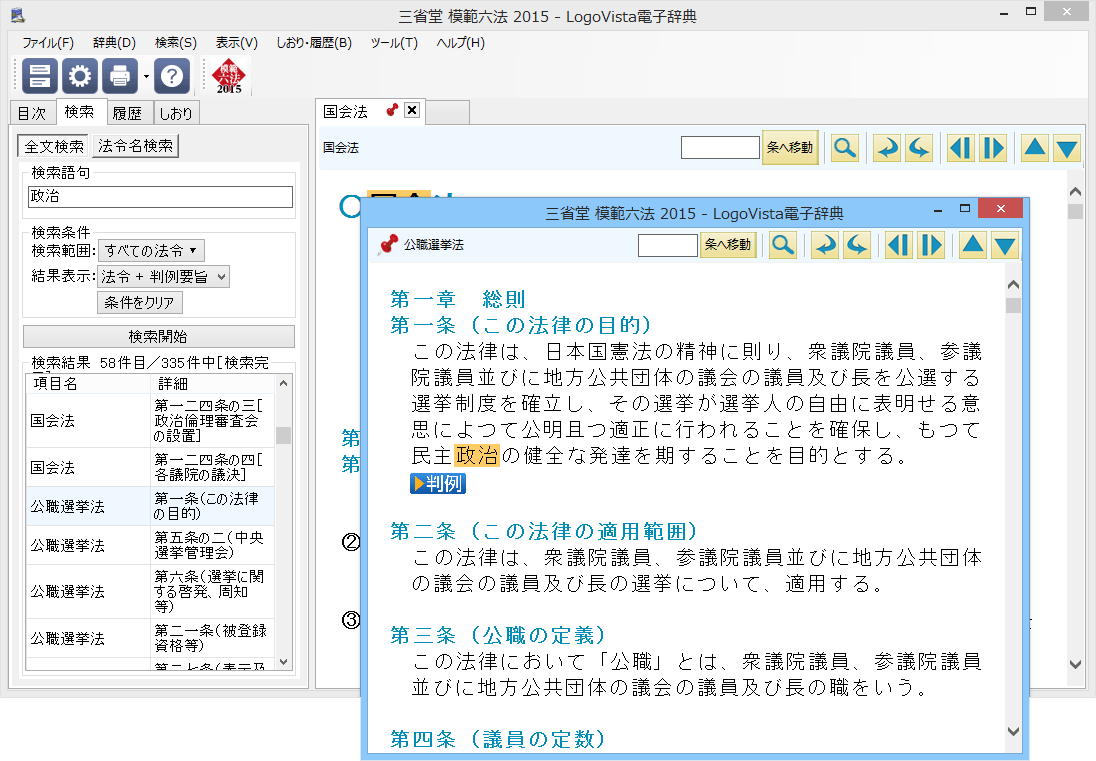 『模範六法 2015 平成27年版 CD-ROM』は、1921年の創刊以来、学習と実務に役立つ判例付き法令集として多くの読者に支持されている書籍版「模範六法 2015 平成27年版」の CD-ROM版です。収録法令404件。重要法令41件には1万3,600余に及ぶ判例要旨を収録。豊富な検索方法によって目的の法令・条数を瞬時に見つけだすことができます。また、カタカナの条文をひらがなに変換する、日本国憲法を英文版と比較する、といったことも可能です。